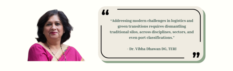 Dr. Vibha Dhawan, highlighted the urgent need for multidisciplinary thinking and integrated collaboration to build a future-ready maritime and logistics workforce. She stressed that continuous learning, adaptability, and the ability to work across traditional sectoral and disciplinary boundaries are now more crucial than domain-specific expertise. To drive a green transition, Dr. Dhawan called for internalising environmental costs through carbon taxes on high-emission modes and enhancing energy efficiency across the entire logistics chain, from shipping to ports and equipment.