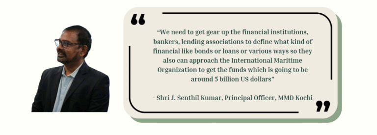 Shri Senthil Kumar addressed the financing dimension of the green transition, highlighting that ESG compliance is increasingly a prerequisite for investment. Institutional investors now incorporate ESG-readiness into due diligence, making regulatory clarity and finance access critical for companies. He noted that while various funding sources exist such as the ₹25,000 crore Maritime Development Fund, ₹16,000 crore Green Hydrogen Mission, and the IMO-led international decarbonisation fund much of it remains underutilized due to lack of awareness, technical capacity and support systems. Furthermore, tools like climate bonds, ESG-linked loans and blended finance models are emerging globally, but their application in India is still limited.